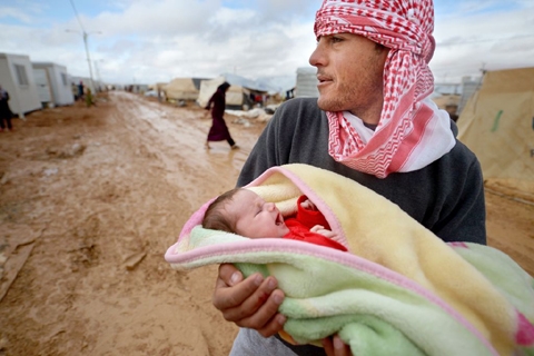 Một người đàn ông bế em bé mới sinh tại trại tị nạn Za'atari vào hôm 31/1/2013 ở Jordan.