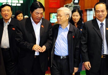 Tổng bí thư Nguyễn Phú Trọng, Trưởng Ban chỉ đạo TƯ về phòng chống tham nhũng và Trưởng Ban Nội chính TƯ Nguyễn Bá Thanh bên hành lang Quốc hội. (Ảnh: Minh Thăng)