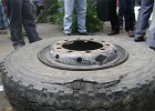 Sau khi vá lốp xong, trong quá trình bơm hơi, đột nhiên vỏ lốp xe tải nổ tung.