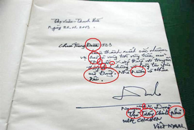 Thủ bút của ông Nguyễn Tấn Dũng khi đến thăm Trung Ðoàn Không Quân 923. Các vòng tròn khoanh đỏ là những chữ sai chính tả. (Hình: Báo Tiền Phong)