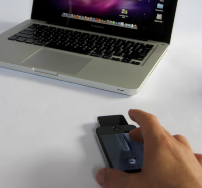 Thiết bị Mauz được cắm vào iPhone và kết nối với laptop thông qua wifi. Khi đó chiếc iPhone của bạn trở thành chuột máy tính. Bạn có thể dùng nút trái, nút phải và thanh cuộn.