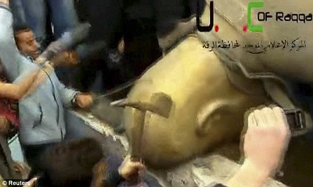 - Những tay súng nổi dậy đã kéo đổ bức tượng đồng cha Tổng thống Bashar al-Assad và dùng búa đập tượng sau khi chiếm được thành phố Raqqa, một trong những thành phố lớn nằm phía đông bắc Syria vào ngày 4.3.