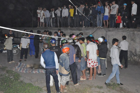 Rất đông người dân đứng trên cầu và vây quanh xác nạn nhân. Ảnh: Văn Định.