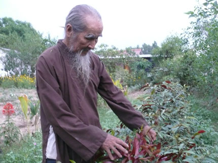 Cụ Mười năm nay đă tuổi 93, râu dài chấm ngực, tóc búi củ hành, vầng trán cao, da đỏ hồng... nom cụ đạo mạo tựa tiên ông giáng trần. Ở tuổi "cổ lai hi" cụ vẫn ngày ngày cầm cuốc xới đất, leo núi, lội rừng, gánh nước... lanh lẹ như người b́nh thường. Mảnh đất cụ đang mở pḥng thuốc có nguồn gốc từ đời cụ kỵ. Cụ nguyên gốc là ḍng dơi của đại thần triều Nguyễn Phan Thanh Giản (1796-1867) ở Bến Tre. Thời Pháp ḍng họ bị tru di tam tộc nên phải đổi họ Phan thành Nguyễn rồi bỏ xứ tha hương lên B́nh Dương. Cụ Mười sinh ra ở đất này và tiếp nối nghề y có từ thời ông cố. Cụ theo đạo Tịnh độ cư sỹ Việt Nam, xuất gia tha hương vừa tu vừa làm thuốc từ thuở niên thiếu, ngày trở về quê cha đất tổ hành trang cũng chỉ có những bài thuốc quư. Mảnh đất bao năm không người canh giữ mọc đầy lau sậy cụ lại xới sạch, khoanh vùng rồi trồng những cây thuốc quư hiếm mang về từ rừng núi để phục vụ công việc cứu người, không vương tư lợi.