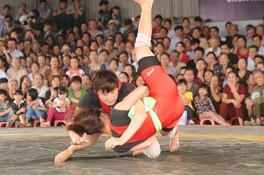Đô vật Hoàng THị Phương với miếng đánh quyết định hạ gục đối thủ để đoạt hạng Nhất nữ. Ảnh: Đàm Duy