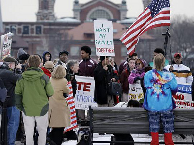 Với Ellis Island ở phía sau lưng, một nhóm người đấu tranh tập họp hôm Thứ Tư, trung tuần Tháng Hai, tại Liberty State Park thuộc thành phố Jersey City để đòi quyền lợi cho di dân. (Hình: Mel Evans, AP)
