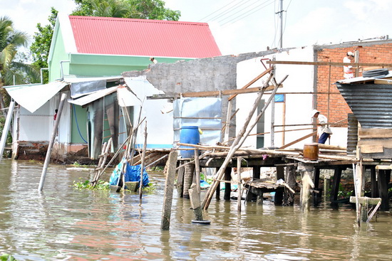 Khu vực sạt lở dài hơn 80 m, lấn sâu vào đất liền gần 20 m thuộc ấp Mỹ Ái, xã Mỹ Khánh. Hai ngày trước nơi đây xuất hiện vết nứt, tường nhà dân bị xé toạc nên chính quyền địa phương đã cảnh báo nên lúc sạt lở dãy nhà sau không có người nào ở trong các căn hộ.