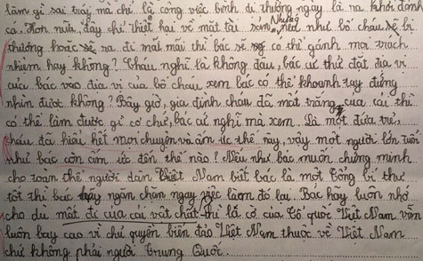 Mấy hôm trước cháu được biết rằng tàu Trung Quốc đã bắn súng lửa vào tàu đánh cá của bố cháu làm mọi thứ cháy rụi. Sau khi biết tin này cháu cảm thấy rất phẫn nộ và căm tức... Cháu biết rằng Việt Nam chỉ nhỏ bằng một tỉnh thành của Trung Quốc. Vậy mà sao Trung Quốc lại làm như thế, thật là một việc làm không thể chấp nhận. Bác cũng biết rằng Việt Nam là nước yêu chuộng hòa bình rất ghét chiến tranh. Vậy mà Trung Quốc lại rắp tâm cướp đi chủ quyền của Việt Nam, một việc làm thật đáng coi thường. Bây giờ, dụng cụ lao động đã mất trắng, mà bố cháu không làm gì sai trái cả, chỉ là công việc bình dị thường ngày là ra khơi đánh cá.