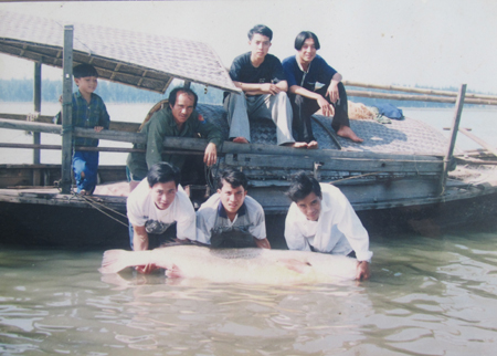 Cá đắt gấp mấy lần vàng nên mỗi khi phát hiện ra loài cá này, các ngư dân thường vây bắt cho kỳ được. Nhưng không phải ai cũng may mắn phát hiện được nó. Thỉnh thoảng người ta cũng tóm được một chú nhưng chỉ cỡ vài kg đến 1-2 yến là cùng. “Loài cá này có đặc tính rất lạ là nó chỉ sống và kiếm ăn theo lạch nước cố định nhưng thường nằm rất sâu. Thỉnh thoảng nó mới phát ra tiếng kêu như tiếng bò rống. Anh nào may mắn nghe được tiếng rống của con cá thì mới có thể xác định được vị trí của nó. Lúc đó chỉ có việc giăng lưới và… chờ thôi”, ông Lới kể tiếp. | Với con cá sủ vàng nặng gần 7 yến, ông Lới đã bán được 170 triệu đồng - một kỷ lục vào thời điểm năm 1998 (ảnh gia đình cung cấp) |