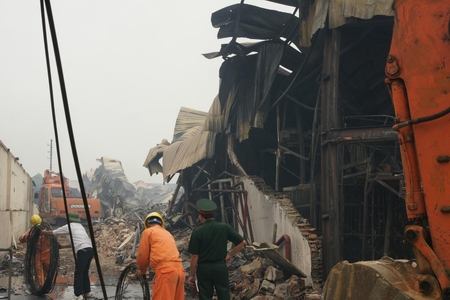 Ngày 7/4, những ngọn lửa nhỏ vẫn âm ỉ cháy, khói vẫn quyện trong đám hoang tàn đổ nát sau vụ hỏa hoạn kinh hoàng khiến hơn 1000 xe máy bị thiêu rụi tại Công ty Cổ phẩn May Xuất khẩu Hà Phong, Bắc Giang.