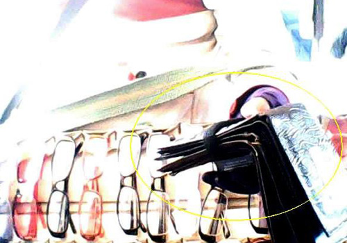 Hộp thuốc kích dục để ở dưới tay người phụ nữ và ngụy trang bằng mấy chiếc ví phía trên.