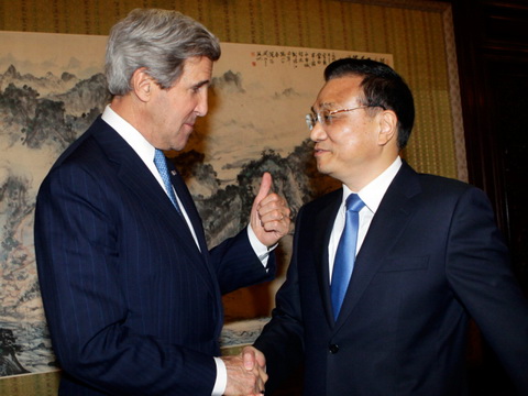 | Ngoại trưởng Kerry (bên trái) trong cuộc gặp với Thủ tướng Trung Quốc Lư Khắc Cường. |