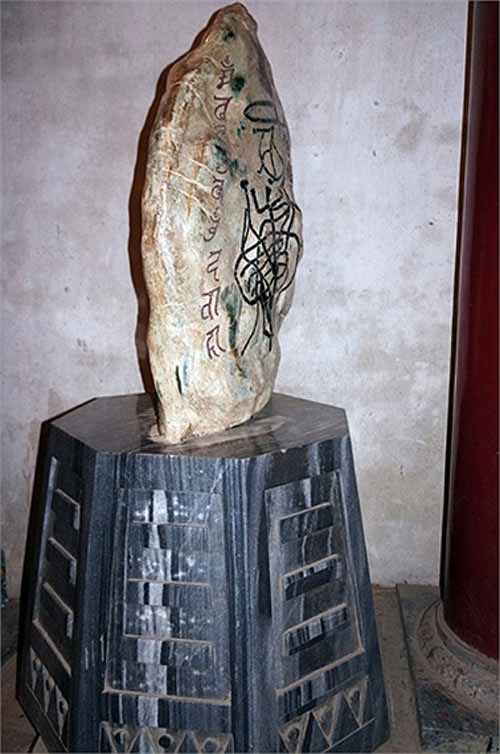 “Hòn đá lạ” cao khoảng 50 cm, bề rộng nhất 35 cm, hình cánh buồm đặt trên bệ được gia cố khá đẹp, đặt trong đền Thượng. Mặt trước và sau của hòn đá có ký tự cổ, dấu ấn vuông, họa tiết phức tạp khó hiểu.