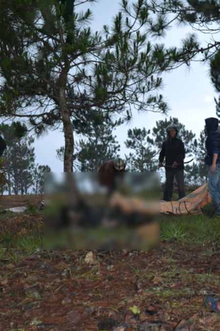 Vụ việc được phát hiện vào lúc 15h ngày 16/4, trên một quả đồi thông thuộc phường 11, TP Đà Lạt. Nạn nhân được xác định là nam, ngoài 20 tuổi, thi thể đă bị cháy đen, nằm ngửa mặt lên trời, rất khó nhận dạng. Qua khám nghiệm hiện trường, cơ quan chức năng c̣n phát hiện kề đó có 2 lọ thuốc trừ sâu.