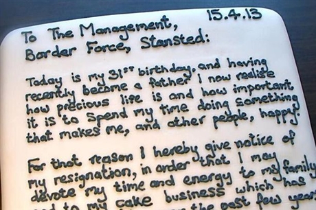 Anh Chris Holmes, 31 tuổi quyết định từ bỏ công việc đang làm tại sân bay Stansted, London, Anh quay về quản lí một cửa hàng bánh. Điều ngạc nhiên là anh viết lá thư từ chức trên chính chiếc bánh của ḿnh.