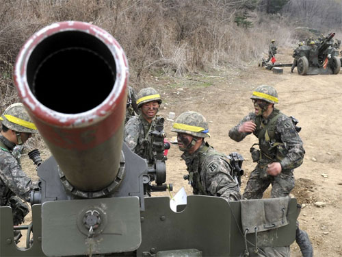 Binh sĩ Hàn Quốc diễn tập quân sự gần khu vực phi quân sự ở Paju. Ảnh Reuters