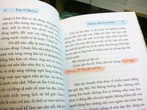 Theo đó, phần nội dung truyện ngắn “Làm thế nào kể một câu chuyện chân thực về chiến tranh” trong cuốn sách trên, tại ḍng 9 – 10 trang 95, có câu văn: “Con mặt l** ngu đ** bao giờ trả lời” (các dấu * thay thế cho từ ngữ tục tĩu trong câu văn – PV).