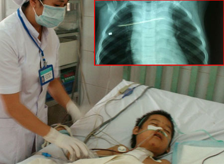 Tại đây, sau khi chụp XQ, các bác sĩ giật mình vì trên ngực bệnh nhân xuất hiện một đường cắt ngang từ ngực trái, xuyên qua phổi trái và tim, sau đó dừng lại trong phổi phải.