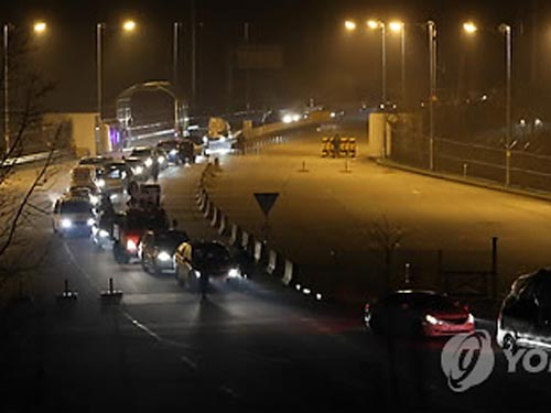 Đoàn xe chở 43 người Hàn Quốc về nước rạng sáng 30-4. Ảnh: Yonhap