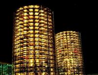 - Hai tháp xe hơi “khổng lồ” được thiết kế bằng thép mạ kẽm và kínhchiếu sáng vào ban đêm. Mỗi tháp cao 60 m, chứa tối đa 400 xe.