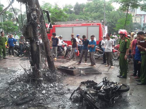 Vào thời điểm trên, nhiều người có nghe một tiếng nổ lớn, sau đó ngọn lửa bùng cháy dữ dội tại cột điện phía trước căn nhà số 5, đường Nguyễn Khang. Lúc này, chiếc xe máy mang BKS 99H4 đỗ phía dưới cột điện đă bị ngọn lửa bén, thiêu rụi hoàn toàn.