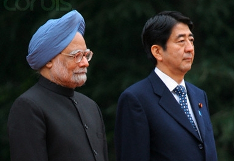 Thủ tướng Ấn Độ Manmohan Singh (trái) và Thủ tướng Nhật Bản Shinzo Abe