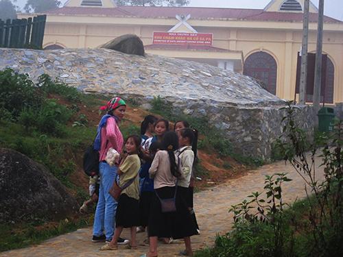 Một du khách đang bị nhóm trẻ bán quà lưu niệm truy đuổi ráo riết ở bãi đá cổ Sa Pa. Ảnh: MINH CHÂU