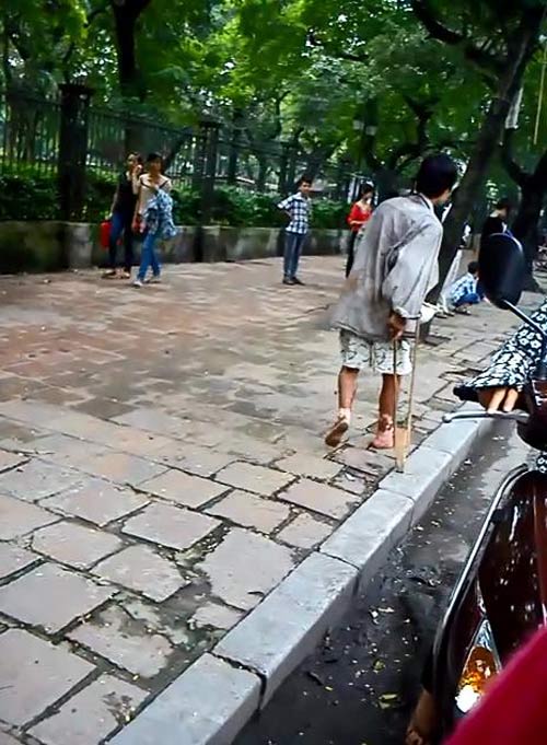 Gã ăn mày lê chân với chiếc nạng và đôi chân lở loét cùng vẻ mặt tội nghiệp để xin tiền người đi đường và du khách nước ngoài tại ngã tư Văn Miếu. (ảnh chụp sáng 31/5).