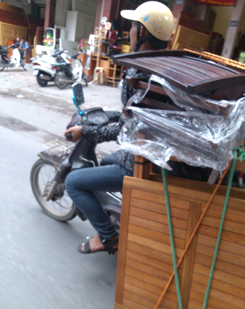 Vào vai một đôi vợ chồng sắp cưới đi mua giường và tủ, chúng tôi vào cửa hàng V.D (số 1084, đường La Thành) để chọn đồ. Người chủ hàng niềm nở giới thiệu cho chúng tôi nghe về các mặt hàng. Khi đă ưng ư với chiếc tủ 5 ngăn, chúng tôi thắc mắc làm thế nào để chuyển được món đồ cồng kềnh này về căn pḥng trên tầng 5, người phụ nữ bán hàng trấn an bằng cách chỉ về người đàn ông có nước da ngăm đen đang đứng gần chiếc xe dream.