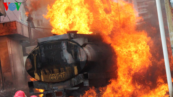 Xe téc bùng cháy lên dữ dội sau những tiếng nổ lớn