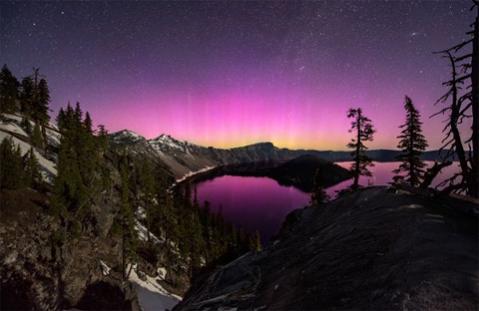 Không chỉ bầu trời và mặt nước, mà dường như ngay cả những cây trên sườn dốc quanh công viên quốc gia Hồ Crater, bang Oregon, Mỹ cũng chuyển màu bởi sự hiện diện của cực quang tím vào tối 31/5. Ảnh: National Geographic.