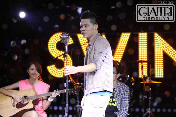 Cô nàng còn trổ tài đệm guitar cho ông bố trẻ Dương Trần Nghĩa ca hát.