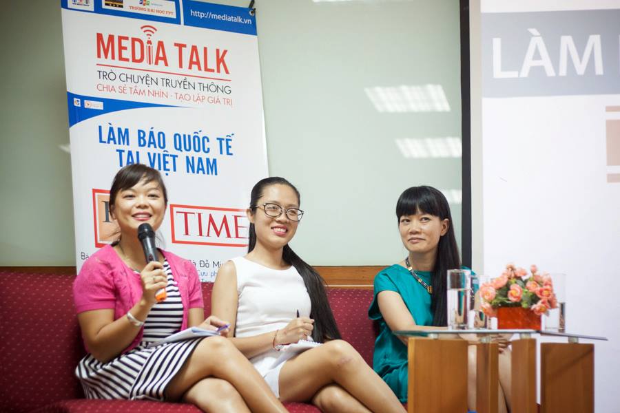 Chị Đỗ Minh Thùy, chị Nguyễn Phương Linh và chị Đào Thu Hiền (trừ trái qua) trong buổi chia sẻ Làm báo quốc tế tại Việt Nam