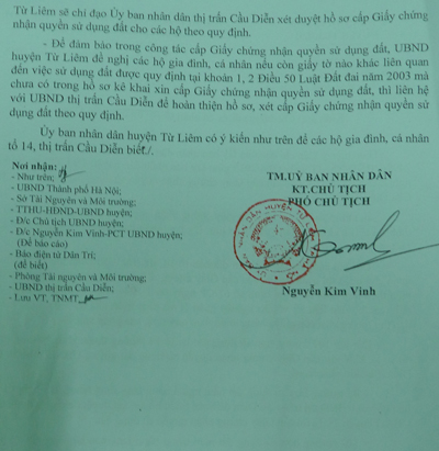 Phải mất đến hơn một năm sau, ngày 23/7/2012, UBND huyện Từ Liêm mới ra được văn bản số 1003/UBND-TNMT gửi UBND TP. Hà Nội; Sở Tài nguyên & Môi trường (TN&MT) đề nghị xem xét giải quyết nguyện vọng được cấp sổ đỏ của các hộ dân tại tổ 14 thị trấn Cầu Diễn, huyện Từ Liêm. Nội dung văn bản của huyện Từ Liêm tiếp tục khẳng định các hộ dân khu vực này đă mua lại đất tự sử dụng phân chia từ trước ngày 15/10/1993.