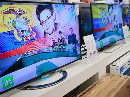 Hình ảnh Edward Snowden trên truyền hình tại một cửa hàng điện máy ở Moscow. Ảnh: REUTERS