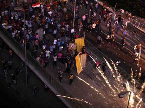 Xô xát trên cây cầu 6 Tháng 10 ở Cairo đêm 5-7. Ảnh: AP