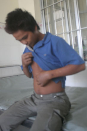 Anh Cao Văn Lệ cho phóng viên xem dấu tích bầm tím. Ảnh: Thanh Thúy