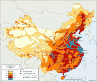 Miền Đông hay Trung Nguyên trù phú nhờ độ ẩm đủ cao cho canh tác và nhờ lưu vực Hoàng hà và Trường giang tương đối thuận lợi cho giao thông buôn bán. Đây là nơi sinh sống của 400 triệu người, với mật độ dân số quá cao. Phần c̣n lại là khu vực hoang vu khô cằn rộng lớn bên trong, rất khó phát triển để nuôi sống 900 triệu dân.