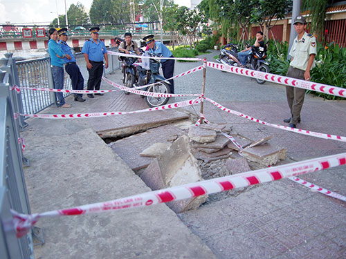 Sáng 12.7, mặt lề đường dành cho người đi bộ trên đường Trường Sa, đoạn gần cầu Lê Văn Sỹ, P.14, Q.3 (TP.HCM) bị sụt lún, tạo hố sâu án giữa lối đi.