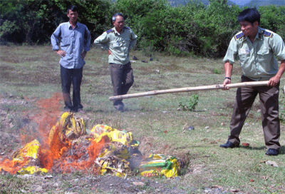 Cơ quan Quản lư thị trường tỉnh Đồng Tháp tổ chức tiêu hủy phân bón giả. |