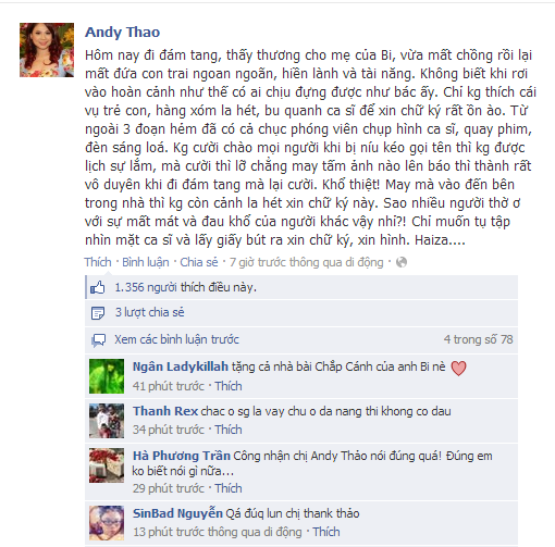 Nữ ca sĩ viết:“Hôm nay đi đám tang, thấy thương cho mẹ của Bi, vừa mất chồng rồi lại mất đứa con trai ngoan ngoãn, hiền lành và tài năng. Không biết khi rơi vào hoàn cảnh như thế có ai chịu đựng được như bác ấy. Chỉ không thích cái vụ trẻ con, hàng xóm la hét, bu quanh ca sĩ để xin chữ ký rất ồn ào. Từ ngoài 3 đoạn hẻm đã có cả chục phóng viên chụp hình ca sĩ, quay phim, đèn sáng loá. Không cười chào mọi người khi bị níu kéo gọi tên thì không được lịch sự lắm, mà cười thì lỡ chẳng may tấm ảnh nào lên báo thì thành rất vô duyên khi đi đám tang mà lại cười. Khổ thiệt! May mà vào đến bên trong nhà thì không còn cảnh la hét xin chữ ký này. Sao nhiều người thờ ơ với sự mất mát và đau khổ của người khác vậy nhỉ?! Chỉ muốn tụ tập nhìn mặt ca sĩ và lấy giấy bút ra xin chữ ký, xin hình. Haiza....”