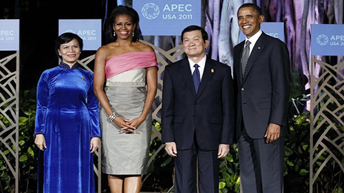 Chủ tịch nước Trương Tấn Sang và phu nhân gặp gỡ vợ chồng Tổng thống Mỹ Barack Obama tại Hội nghị APEC ở Hawaii tháng 11/2011.