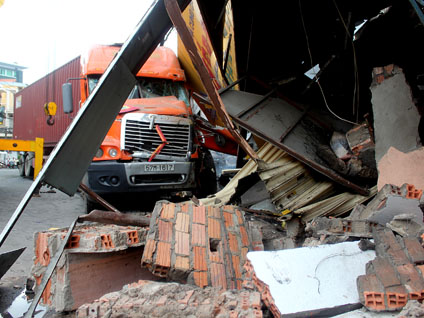 Theo đó, chiếc container đâm xuyên qua nằm lọt giữa nhà số 103 (chuyên kinh doanh sắt thép, vật liệu xây dựng) do bà Kinh Oanh (SN 1958) làm chủ. Theo đà, xe này tiếp tục húc vào cơ sở sữa chữa xe máy của chị Ái Lan (SN 1963).