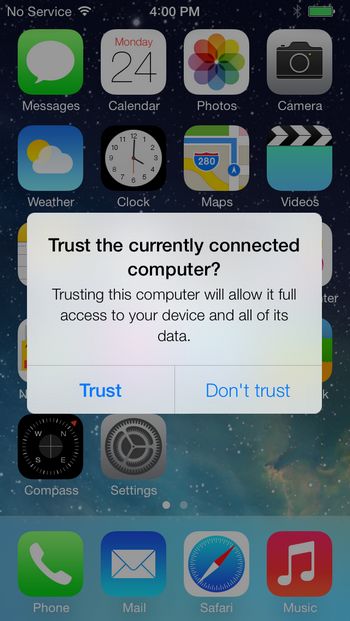 Từ bây giờ, mỗi khi người dùng sử dụng thiết bị chạy iOS 7 kết nối với máy tính qua dây cáp, một hộp thoại thông báo sẽ được hiện lên để hỏi người dùng xem có thực sự đang cắm thiết bị vào máy tính hay không. Nếu đúng có thể nhấn nút “Trust” để xác nhận, ngược lại, nếu họ cắm thiết bị vào cục sạc nhưng hộp thoại thông báo hiện ra, người dùng có thể kiểm tra lại xem có phải đang sử dụng cục sạc giả mạo có một chiếc máy tính bên trong hay không.