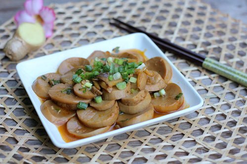 - Đun đến khi ăn thử phần nấm vừa ý, phần nước kho cạn bớt thì bạn tắt bếp, thêm hành lá thái nhỏ. Múc ra đĩa dùng làm món mặn ăn với cơm.