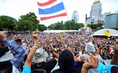 Không khí tại các cuộc mít tinh chống chính phủ ở công viên Lumpin do Đội quân Nhân dân lật đổ chính quyền Thaksin đang trở nên náo nhiệt hơn. Các nhà tổ chức đă dựng một sân khấu tạm rất lớn phía trước Tượng đài vua Rama 4 với thông điệp “Thời khắc phá hủy đất nước đă tới. Kẻ bạo ngược phải cút đi”. Các diễn giả đă lên sân khấu để chỉ trích chính phủ.