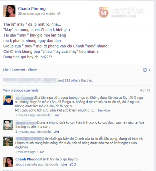 "Thế là "mày" đã lộ mặt rồi nhé. "Mày" cứ tưởng là chị Chanh không biết gì à. Tại sao "mày" bây giờ mới lên tiếng mà không phải là những ngày đầu tiên. Group của "mày" mới điện thoại phỏng vấn chị Chanh "mày" nhưng: chị Chanh không tiếp "chiêu" này của "mày" tiểu nhân à. Đang định gài bẫy chị hả?". - Phương Thanh viết trên Facebook.