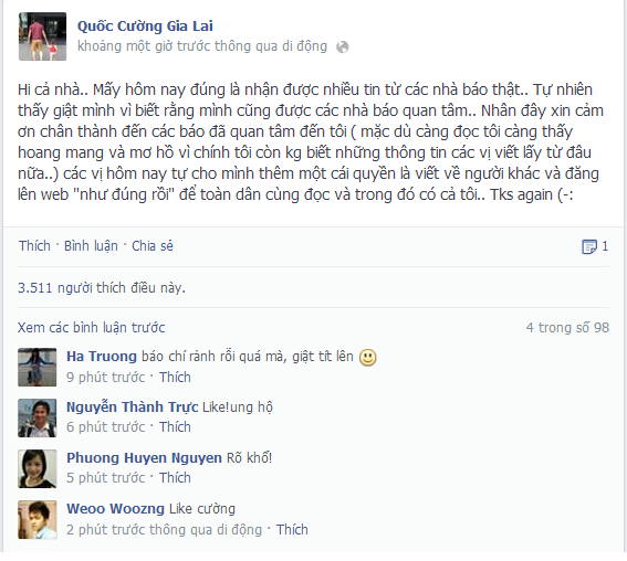Anh viết: "Hi cả nhà. Mấy hôm nay đúng là nhận được nhiều tin từ các nhà báo thật. Tự nhiên thấy giật mình vì biết rằng mình cũng được các nhà báo quan tâm. Nhân đây xin cảm ơn chân thành đến các báo đã quan tâm đến tôi (mặc dù càng đọc tôi càng thấy hoang mang và mơ hồ vì chính tôi còn kg biết những thông tin các vị viết lấy từ đâu nữa..) các vị hôm nay tự cho mình thêm một cái quyền là viết về người khác và đăng lên web "như đúng rồi" để toàn dân cùng đọc và trong đó có cả tôi. Tks again."