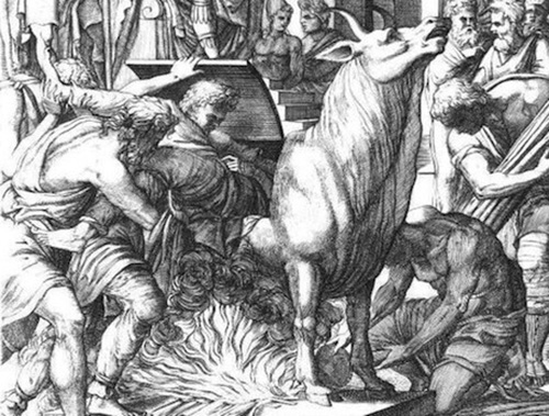 Hình thức tra tấn khủng khiếp này xuất hiện từ thời Hy Lạp cổ đại. Con bò đồng là một khiếc khuôn bằng đồng hình con bò, có một cánh cửa bên thân và rỗng ở phần đầu. Khi bị hành hình, nạn nhân sẽ bị nhốt vào thân con bò, trong khi người tra tấn dùng lửa đốt và thiêu cháy người bên trong. Kinh khủng hơn, đầu con bò được đễ rỗng nhằm phát ra tiếng la hét của nạn nhân và thở ra khói, khiến nó giống như đang rống lên.