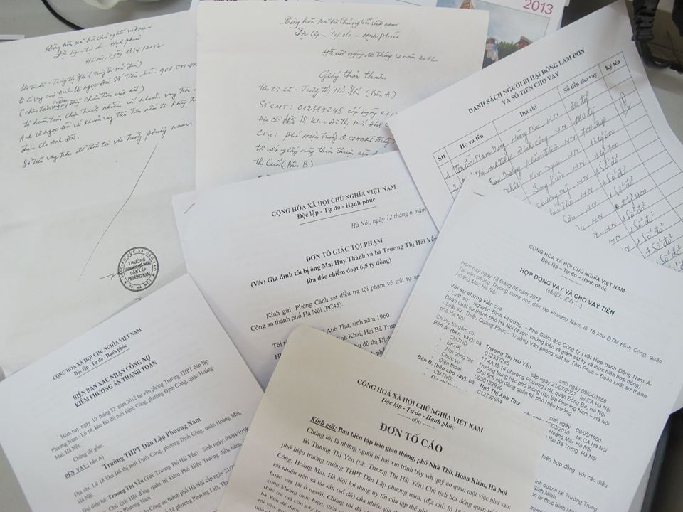 Theo đơn tố cáo của 18 cá nhân, tổng số tiền mà họ cho bà Trương Thị Hải Yến - Phó hiệu trưởng, Chủ tịch HĐQT Trường THPT Dân lập Phương Nam (địa chỉ tại Lô 18, khu đô thị mới Định Công, quận Hoàng Mai, Hà Nội) vay trên 268 tỷ và 16 quyển sổ đỏ. Sau nhiều năm quá hạn, bà Yến vẫn chưa hoàn trả cho các khổ chủ.